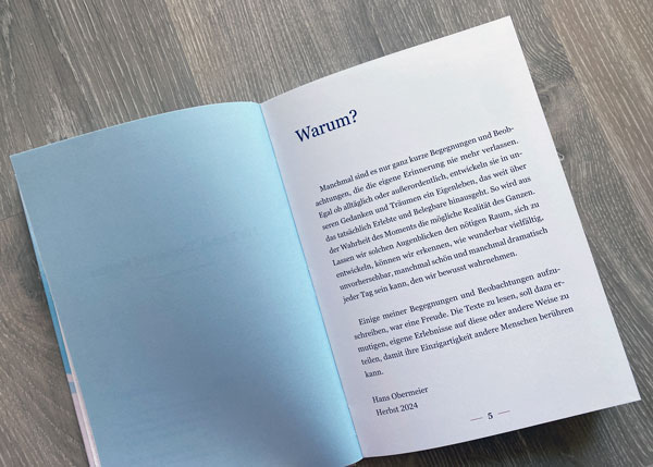 Ich liebe solche Fragen. Aber natürlich geht das. Machen wir halt 2 Bücher. Ein kleines mit 48 Seiten in 2 Wochen, so als „Teaser“, und das große Buch dann danach. Die Schwester des Autors rief mich an, es sollte praktisch das „Lebenswerk“ aus 20+ Jahren Schreiben werden.
